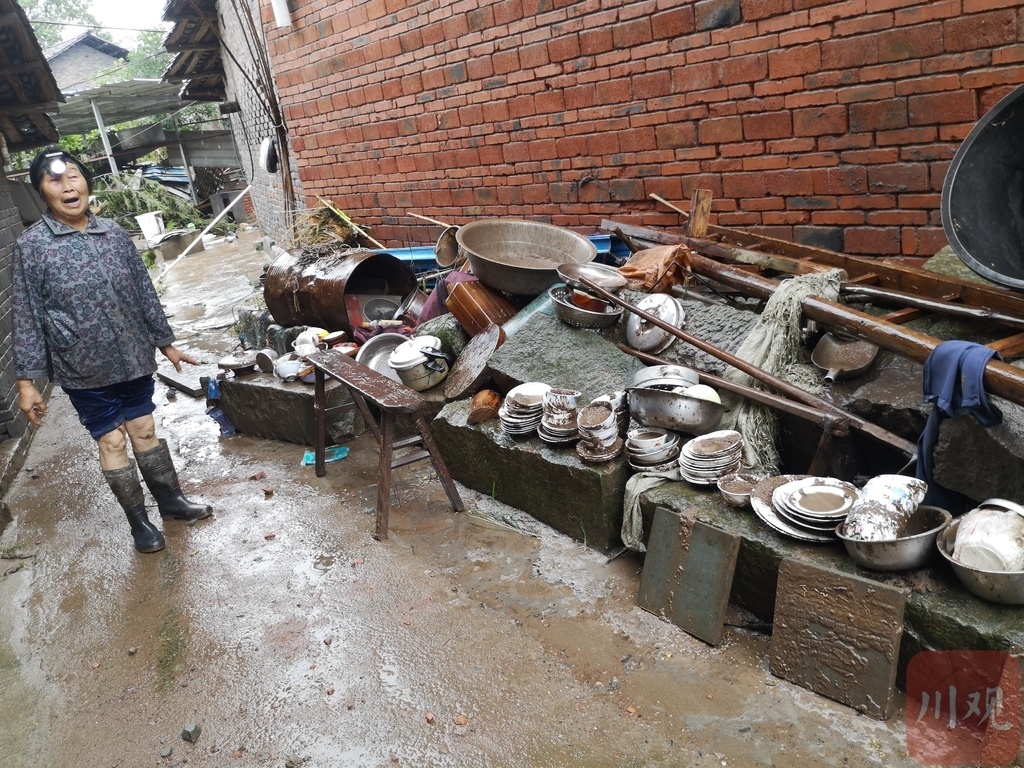 “新买的冰箱、电视全部被冲走,锅碗瓢盆就不说了,你看后面的那堵墙也被冲垮了……”70多岁老人刘多珍把电筒绑在头上,把家里的凳子往外拿。