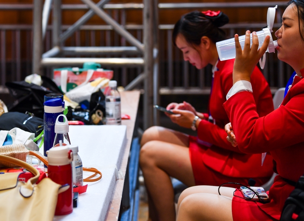7月7日早上8点半,讲解员们在开馆前进行统一练习,她们每天如此,以便以最好的状态迎接观众。