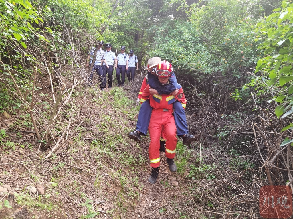 公园路特勤站5名消防员到场后,在民警的带领下,从另一边一路向上搜寻。由于道路崎岖无法快速行走,等搜寻到迷路男子及两名警察时,已是18时3分。因天气炎热,长时间未进食饮水,加上脚踝有旧伤,该男子此时已经体力不支,消防员随即将携带的食品及饮用水拿给老人和民警充饥,休息片刻后由三名消防员轮流背着男子沿陡峭的小路护送至大路。18时50分,历时6小时,消防员成功将被困人员救出,并移交给派出所民警后离开现场。