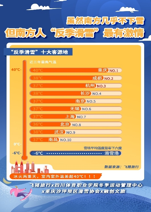 飞猪平台数据发现,南方人更青睐“反季滑雪”。热门客源地前十城市中,南方城市占据九席,各大知名火炉城市均在其中。重庆、成都和杭州位列“反季滑雪”热门客源地前三,长沙、南京、无锡、上海、北京、武汉和南昌分列第四至第十位。
