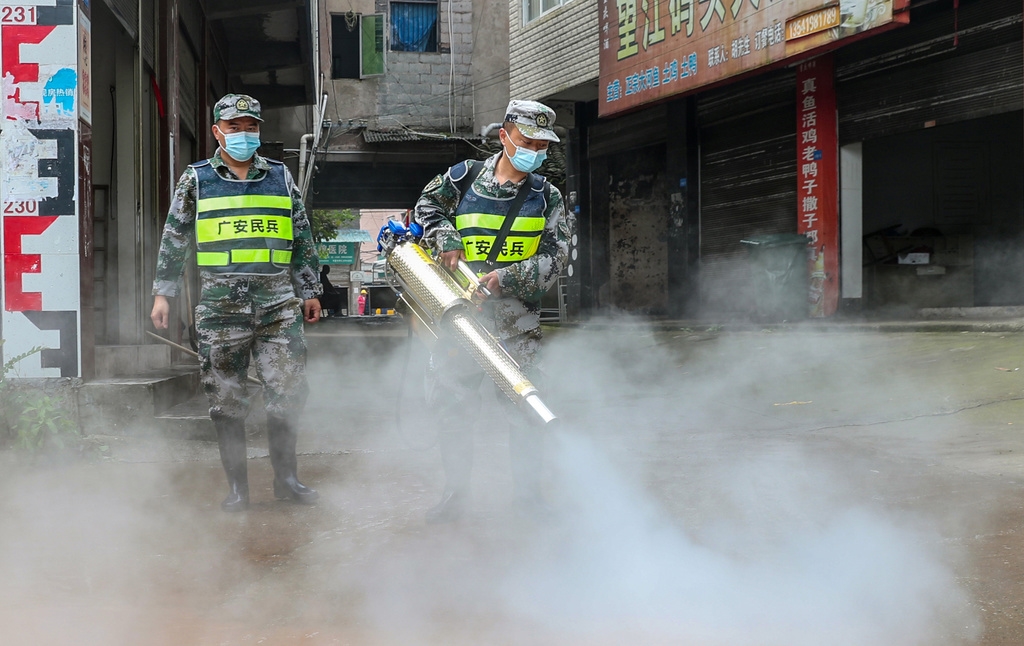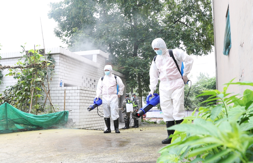 在另一边,华蓥市疾控中心工作人员、民兵等正背着消毒设备对群众的房屋进行消杀,确保灾后无大疫。“洪灾后不喝生水、井水,不食用经洪水浸泡过的食品和淹死的禽畜肉类,做好环境卫生,做到垃圾日产日清,预防虫类疾病暴发和流行。”华蓥市疾病预防控制中心副主任滕彩俊提醒说。
