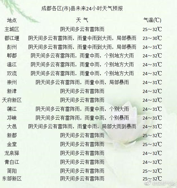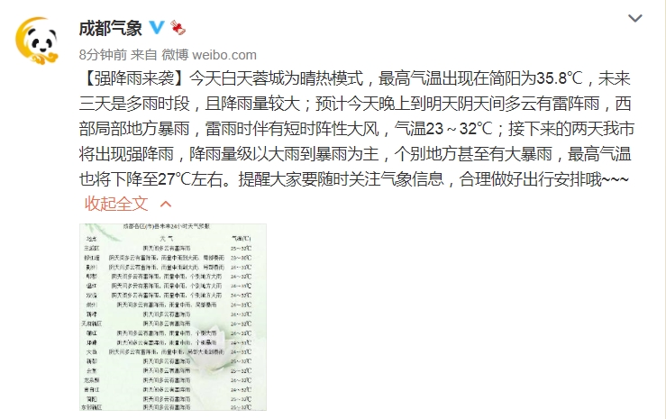 今天白天蓉城为晴热模式,最高气温出现在简阳为35.8℃,未来三天是多雨时段,且降雨量较大;预计今天晚上到明天阴天间多云有雷阵雨,西部局部地方暴雨,雷雨时伴有短时阵性大风,气温23~32℃;
