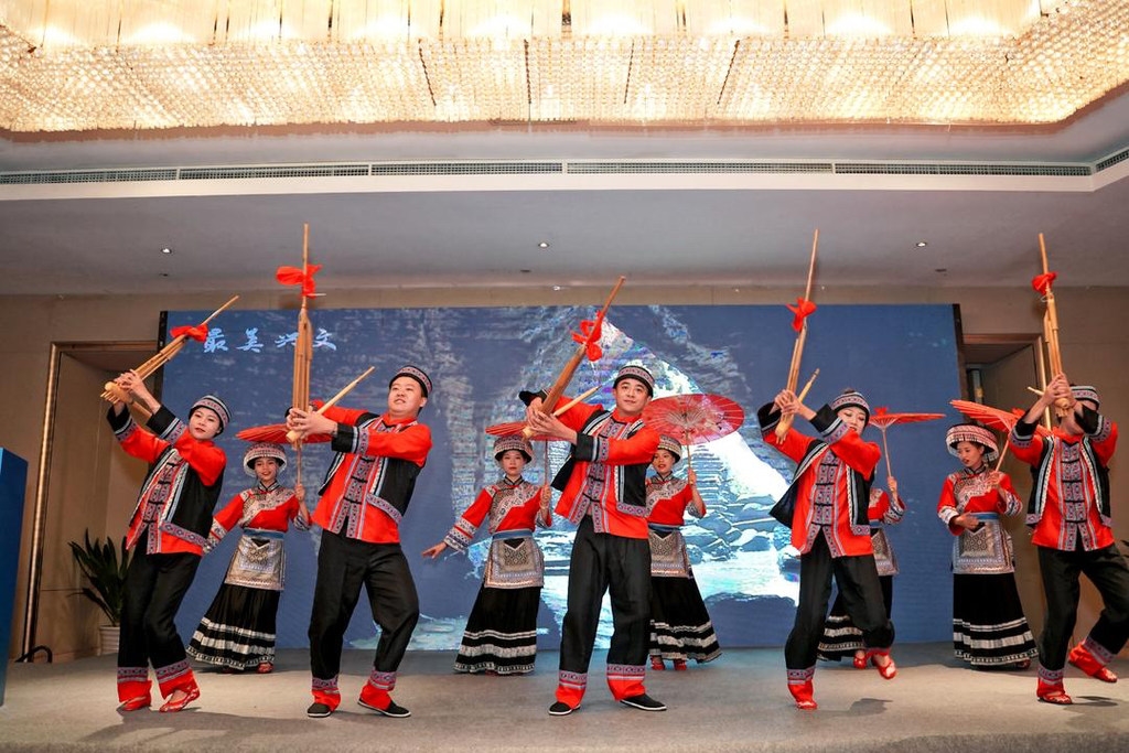 芦笙阵阵,响彻苗寨。7月13日,“秀美苗乡 兴文有您”2021兴文县文旅推介会在成都举行,苗族阿哥阿妹在现场跳起了动人的苗族舞蹈。