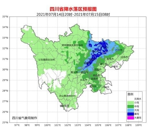 7月15日白天到晚上,盆地各市阴天有阵雨或雷雨,雷雨时有短时阵性大风,达州、广安、泸州3市小到中雨,盆地其余大部中到大雨,其中广元、绵阳、德阳、成都、雅安、眉山6市和遂宁、资阳、内江3市西部、乐山北部的部分地方有暴雨,局部大暴雨;川西高原和攀西地区阴天有阵雨或雷雨,其中,阿坝州东部南部、甘孜州南部和攀西地区局部有中到大雨。