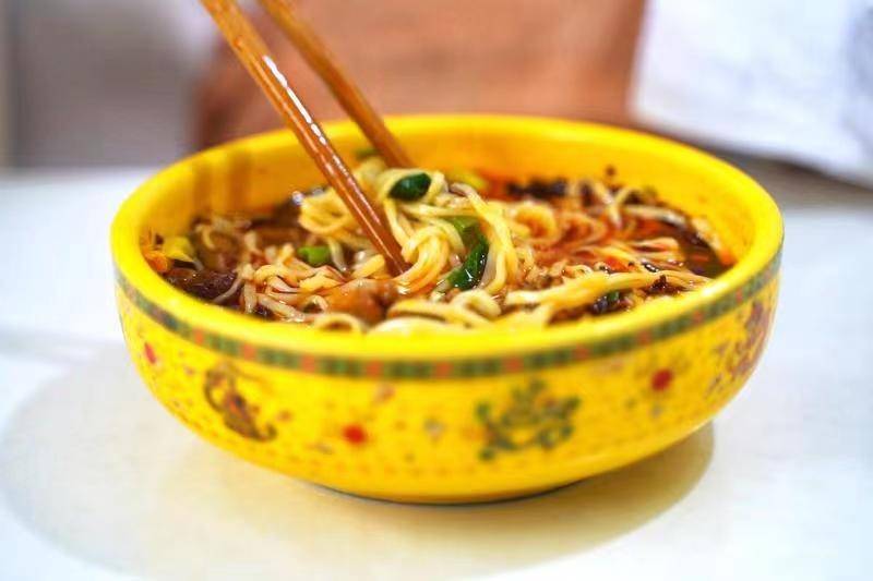 一碗花数小时精心熬制的高汤中,细面含碱、两厘米见方的牛肉块,入味劲道,熟油海椒的配制是店家的秘方,再洒上些许细碎香菜,一碗牛肉面色香味俱全,吃得食客酣畅淋漓。