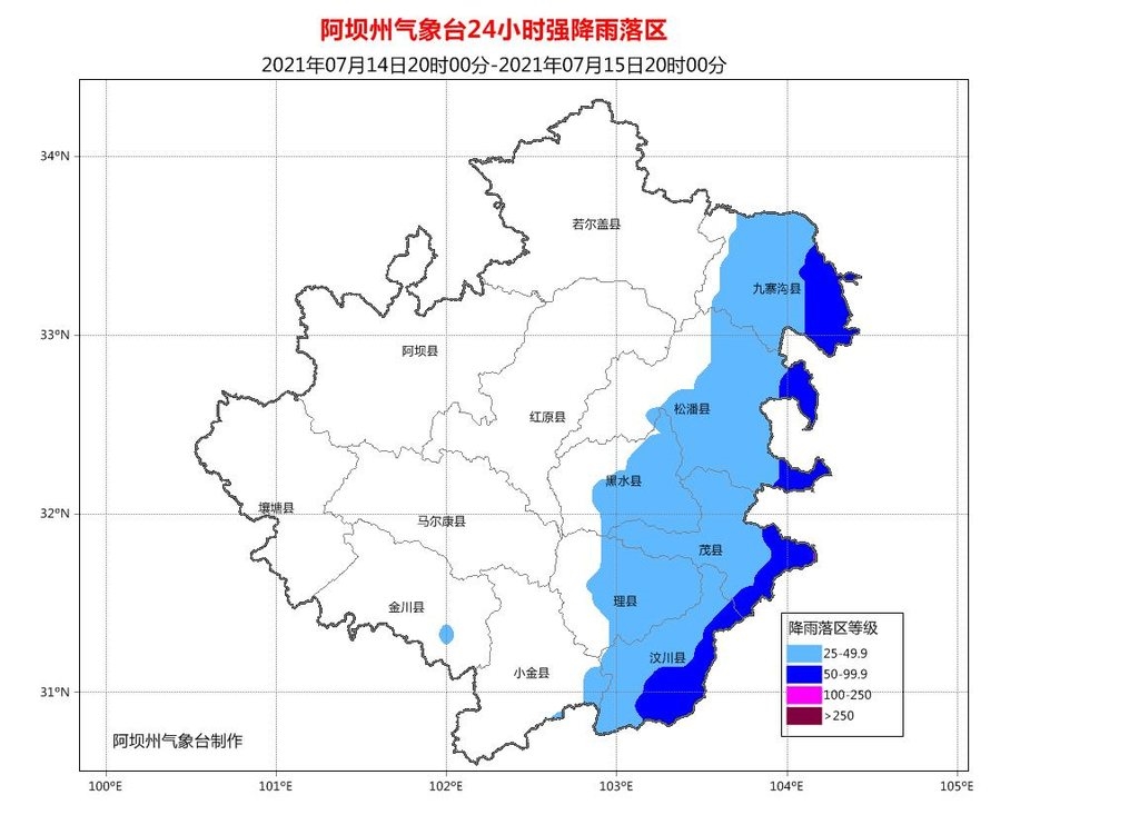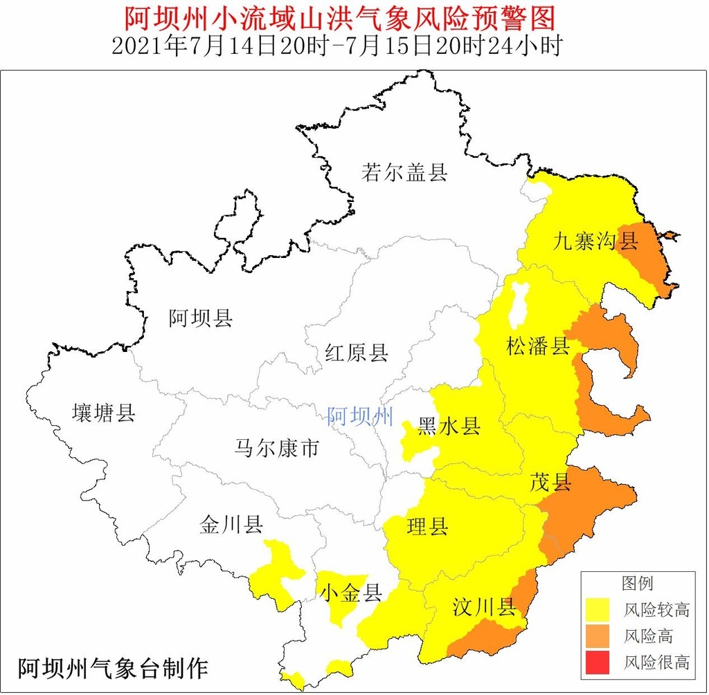 根据气象资料分析,14日20时-15日20时24小时,汶川县、理县、茂县、松潘县、九寨沟县、金川县、小金县、黑水县等8县(市)发生山洪灾害气象风险等级较高,其中汶川县、茂县、松潘县、九寨沟县的部分地方发生山洪灾害气象风险等级高。