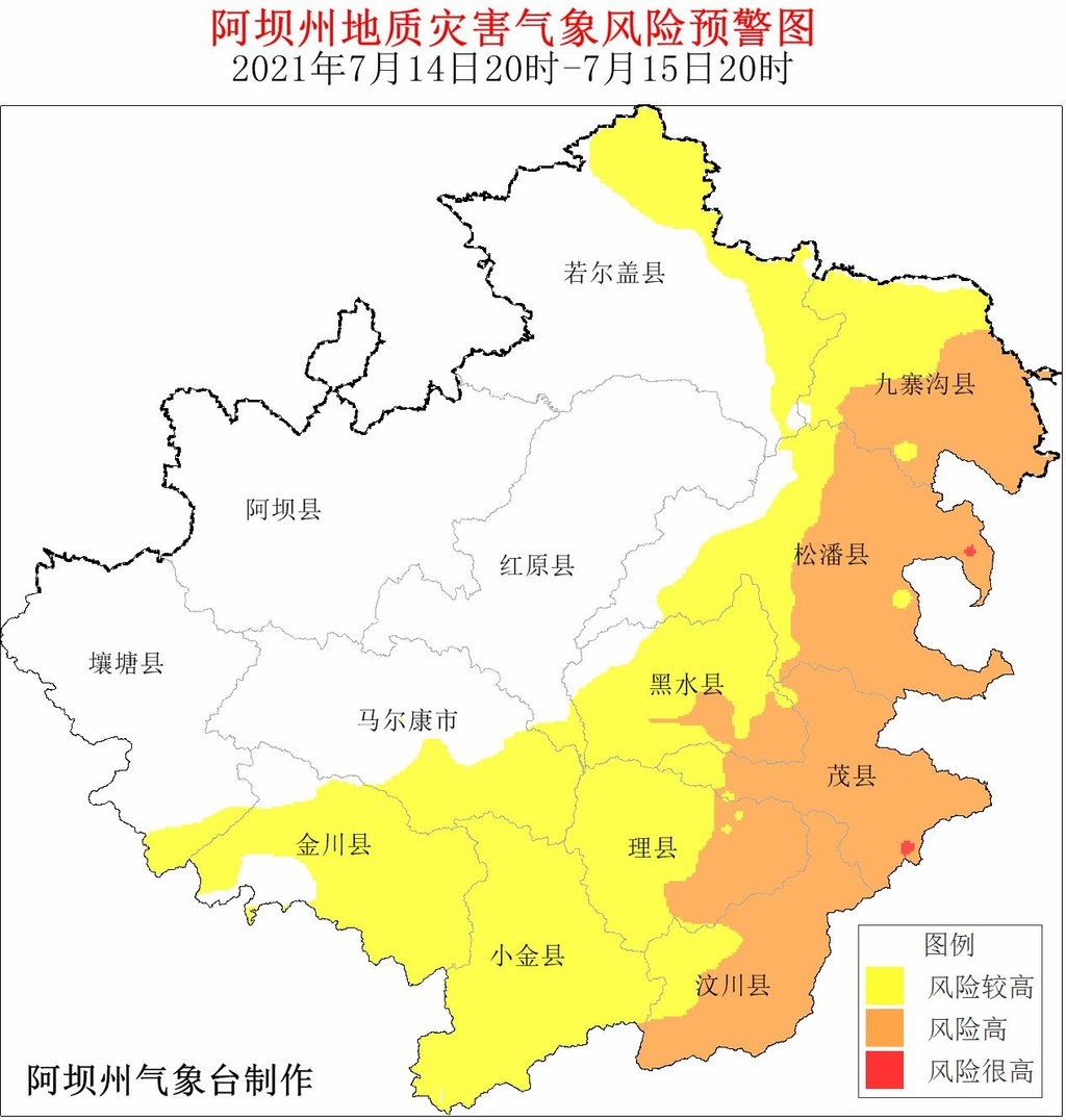 预计,14日20时-15日20时,汶川县、理县、茂县、松潘县、九寨沟县、金川县、小金县、黑水县、壤塘县、若尔盖县、红原县、马尔康市等12县(市)发生地质灾害气象风险等级较高,其中汶川县、理县、茂县、松潘县、九寨沟县、黑水县的部分地方发生地质灾害气象风险等级高。