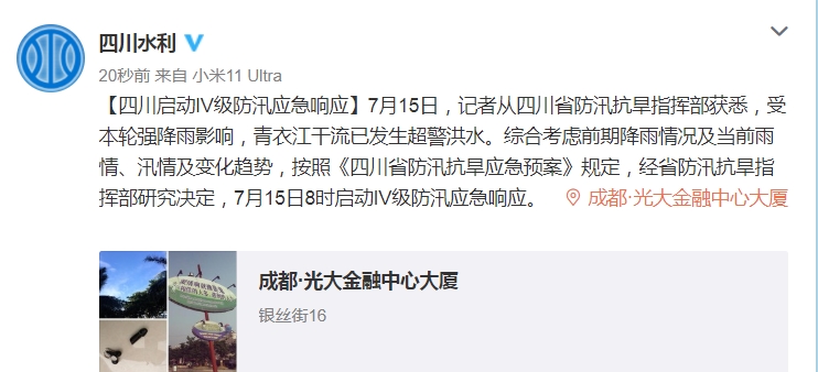 7月15日,记者从四川省防汛抗旱指挥部获悉,受本轮强降雨影响,青衣江干流已发生超警洪水。综合考虑前期降雨情况及当前雨情、汛情及变化趋势,按照《四川省防汛抗旱应急预案》规定,经省防汛抗旱指挥部研究决定,7月15日8时启动IV级防汛应急响应。