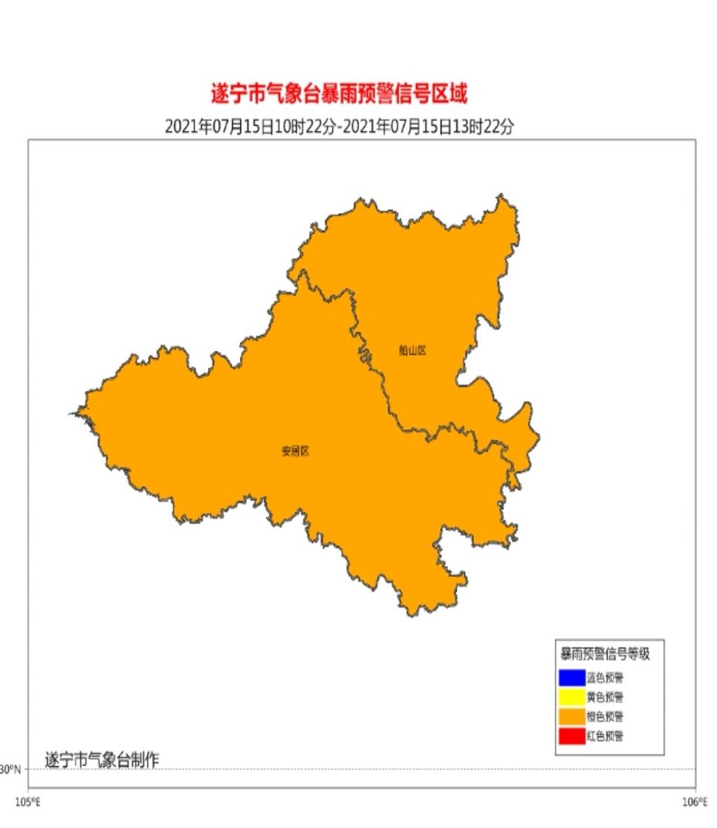 7月15日10时22分,遂宁市气象台发布暴雨橙色预警信号:
