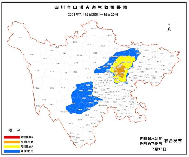 7月15日20时至16日20时,涪城、三台、旌阳、罗江、中江、广汉、金堂等县(市、区)发生山洪灾害可能性大(橙色);安州、江油、梓潼、盐亭、北川、乐至、什邡、绵竹、龙泉驿、简阳、彭州、剑阁等县(市、区)发生山洪灾害可能性较大(黄色) ;汶川、茂县、利州、昭化、平武、青川、荥经、汉源、石棉、天全、金口河、峨边、冕宁、越西、喜德、甘洛、木里、康定、九龙、泸定、都江堰等县(市、区)可能发生山洪灾害(蓝色)。