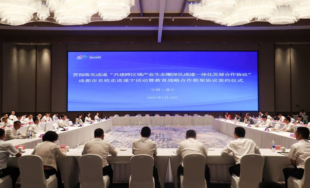 7月15日,贯彻落实成遂“共建跨区域产业生态圈深化成遂一体化发展合作协议”成都市名校走进遂宁活动暨教育战略合作框架协议签约仪式在遂宁举行。根据协议,双方将在开展校际合作、实施队伍建设帮扶、推进教育信息化资源共享、加强职业教育合作和加快教育督导等方面开展合作。