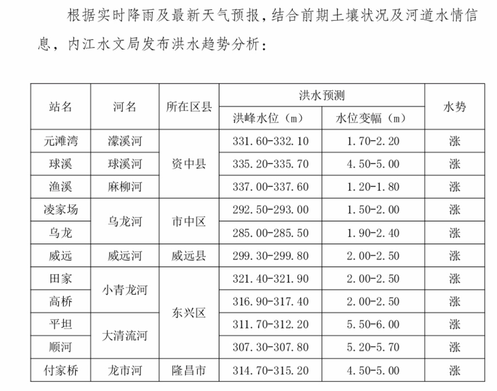 内江水文局相关负责人预测,登瀛岩警戒水位为330.60米,这次洪水不会超警戒水位,同时,也不会超过警戒水位流量(6730立方米/秒)。