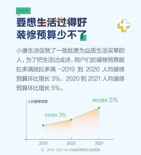 2020年至2021上半年互联网装修用户人均装修预算环比增长约5%,变化趋势差异并不显著,可见即使受到2020年特殊情况影响,装修用户也不想降低自己对品质生活的标准。