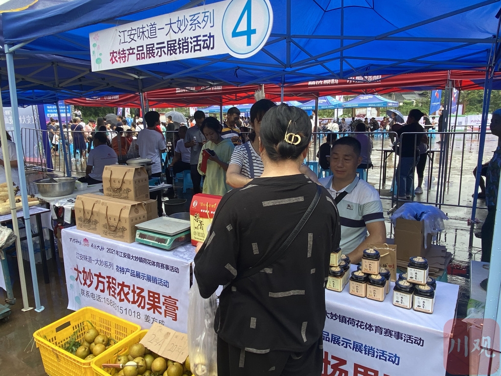在大妙系列特色农产品展销摊上,莲子、莲藕、泥巴腊肉、稻蛙等产品琳琅满目,吸引了不少游客的目光。“主要是向消费者展出特色产品,让他们多多了解产品,同时吸引更多的采购方前来采购。”大妙方程农场果膏的展台上,其负责人姜方成说,通过展出,特色产品得到有效推广。