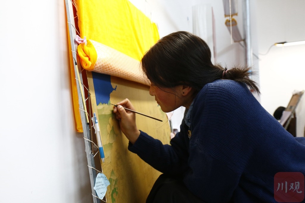 格登特是壤塘县尕多乡刑木达村人,1998年出生在一个多子女的藏族家庭。“我2013年就进壤巴拉觉囊唐卡传习所学习唐卡,一并学习语文、数学、品德等文化课。”格登特说,2016年,他又开始学习藏族编织、挑花刺绣。