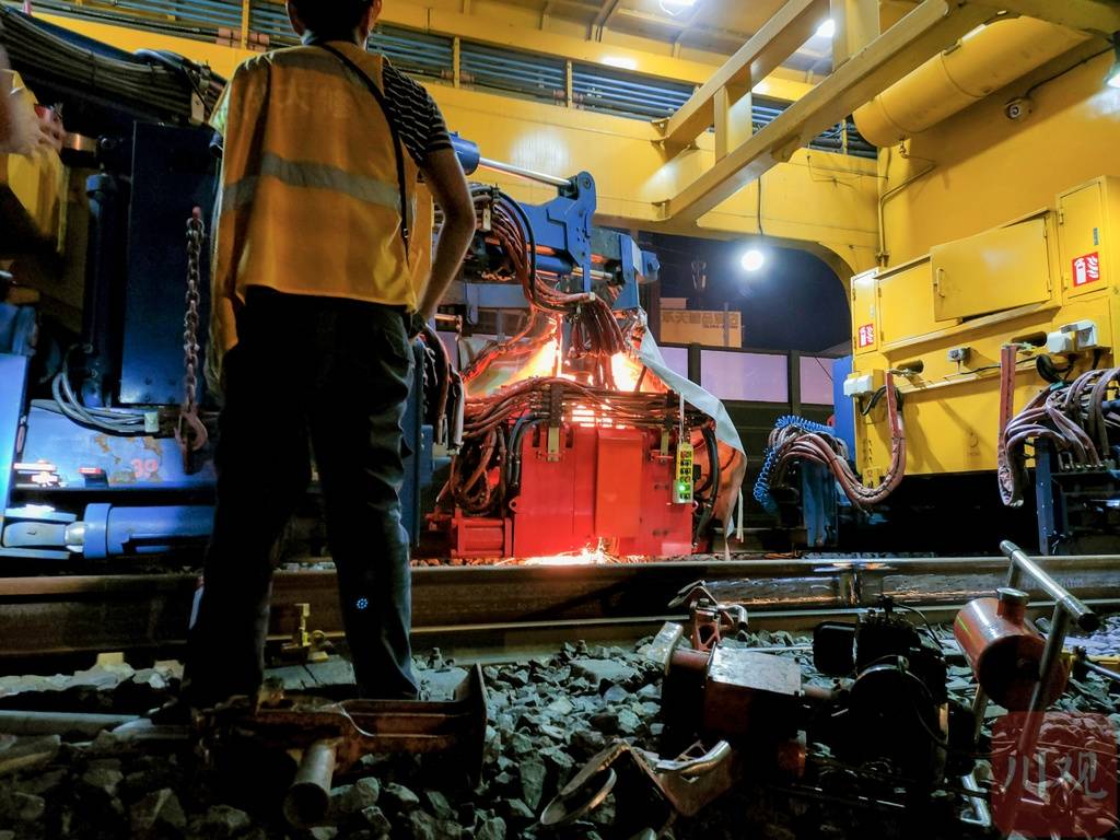 在作业现场,换轨台车拉过曲线时,下股的撞轨器和上股的拉伸机同时使用,共同配合台车,有效解决小半径曲线问题。拆卸扣件、切割钢轨、台车对位、吊新轨上台车、台车运行、旧轨移出、新轨落槽、钢轨焊接、线路回检等各项作业流程按照既定方案有序紧促进行。一时间哨子声、口号声、轨道车鸣笛声、设备与钢轨碰撞声交织在一起,响彻施工现场。