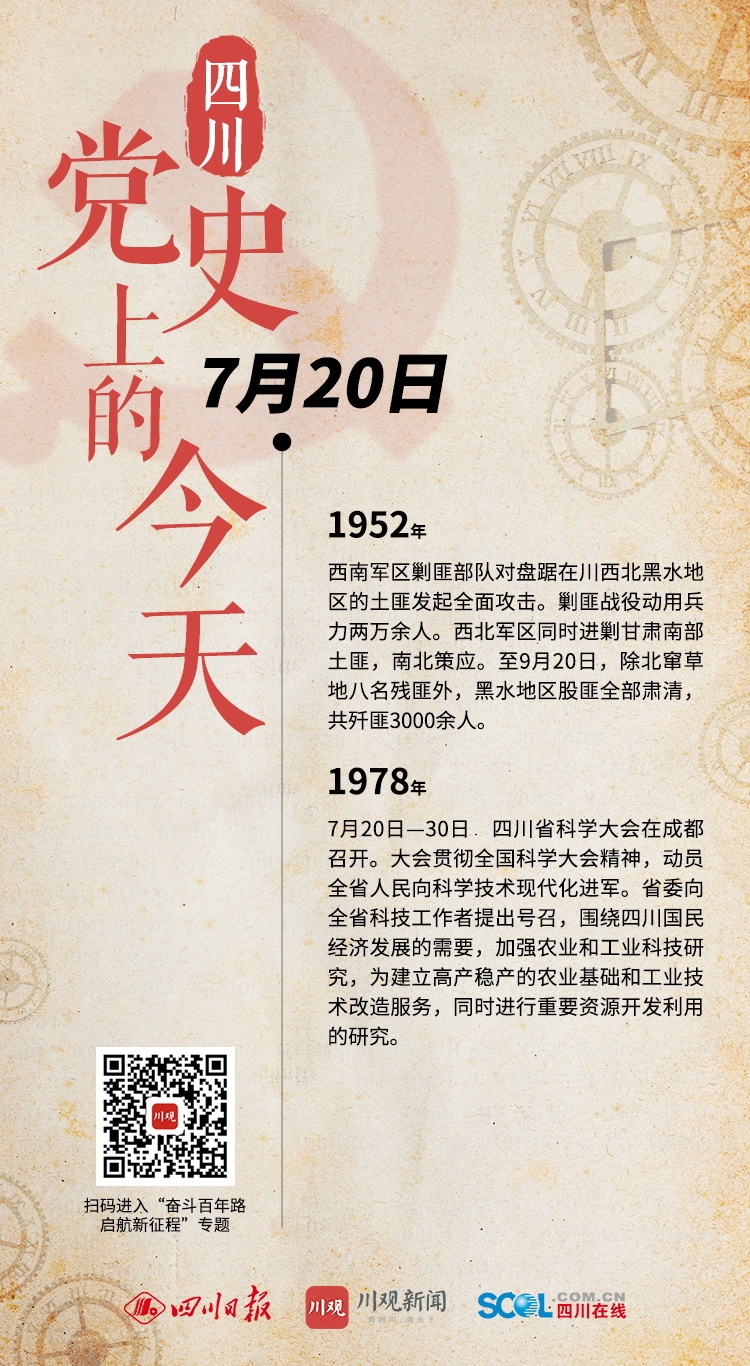 1978年 7月20日—30日 四川省科学大会在成都召开。大会贯彻全国科学大会精神,动员全省人民向科学技术现代化进军。省委向全省科技工作者提出号召,围绕四川国民经济发展的需要,加强农业和工业科技研究,为建立高产稳产的农业基础和工业技术改造服务,同时进行重要资源开发利用的研究。