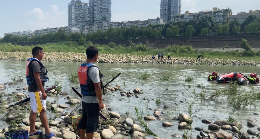 14时18分,6名消防救援队员携带橡皮艇赶到现场,发现3名男性被困河中2个不同区域浅滩,离河岸分别有30米、60米左右。此时,河水上涨变缓,但湍急的水流让被困人员情绪十分紧张。