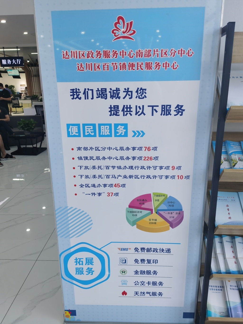 向晓燕告诉记者,达川区政务服务中心南部片区分中心,为南部片区的赵家、双庙等 6 个乡镇的群众提供政务服务,实现“办事不进城”;百节镇便民服务中心,为百节镇群众提供便民服务,实现“办事不出镇”;百马产业新区一站式服务中心,为企业提供全周期服务,实现“办事不出园”。