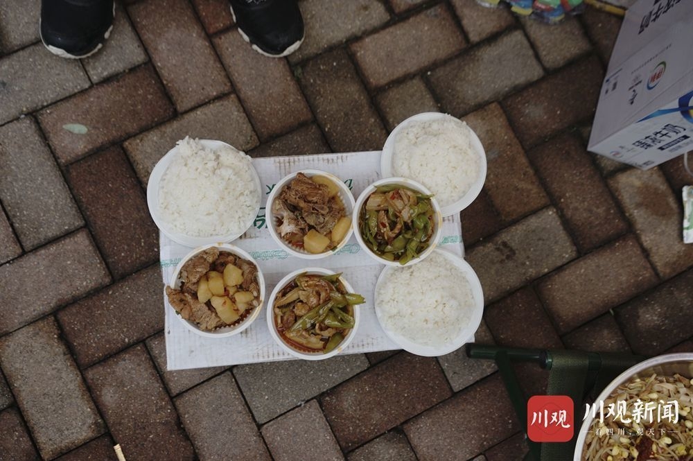 六、七位小区居民用手推车推着两大锅香喷喷的回锅肉、红烧排骨,还有热腾腾的米饭,送午饭来了。