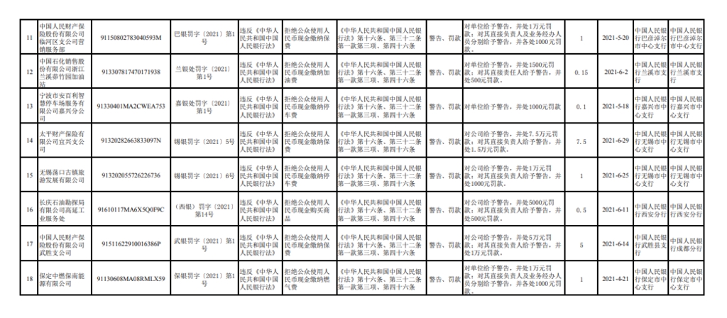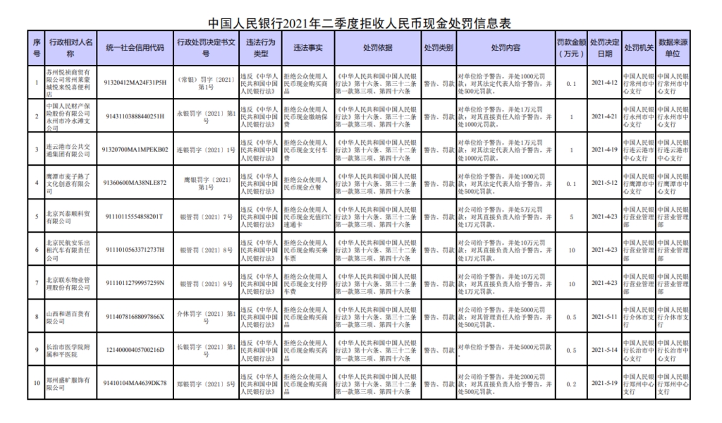 近日,央行官网公布今年二季度拒收人民币现金处罚情况:2021年二季度,人民银行依法对18家拒收现金的单位及相关责任人作出经济处罚,处罚金额从1000元至10万元人民币不等。