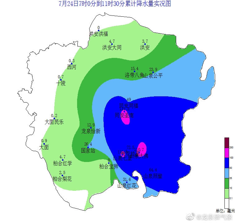 7月24日07时到11时龙泉驿区最大降水量出现在山泉七里埂111.8毫米。具体雨量(单位毫米):同安圣南111.3山泉大佛110.7桃花故里72.5山泉照壁64.4同安同福49山泉红花31.6龙泉国家站26.4山泉公平23.9洛带八角井15.4龙泉怡新12.9,其余站点均在10毫米以下。一小时最强降水出现在山泉大佛58.9毫米。