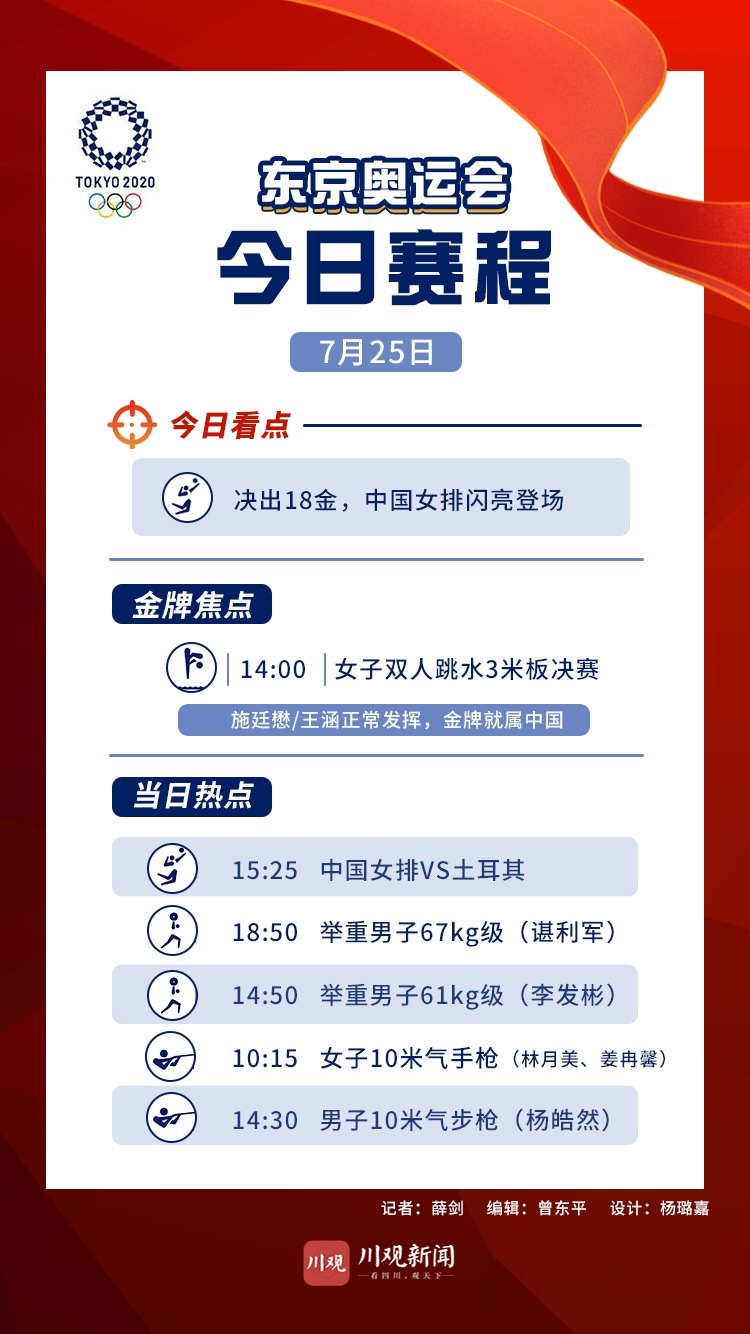 7月25日,2020年东京奥运会将进入第二个比赛日。全天进行游泳、射击、跳水、排球和举重多达29个大项的比赛,将会决出18枚金牌。