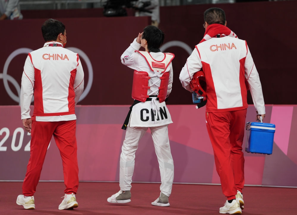 中国选手吴静钰(中)在赛后离场。新华社记者王毓国摄