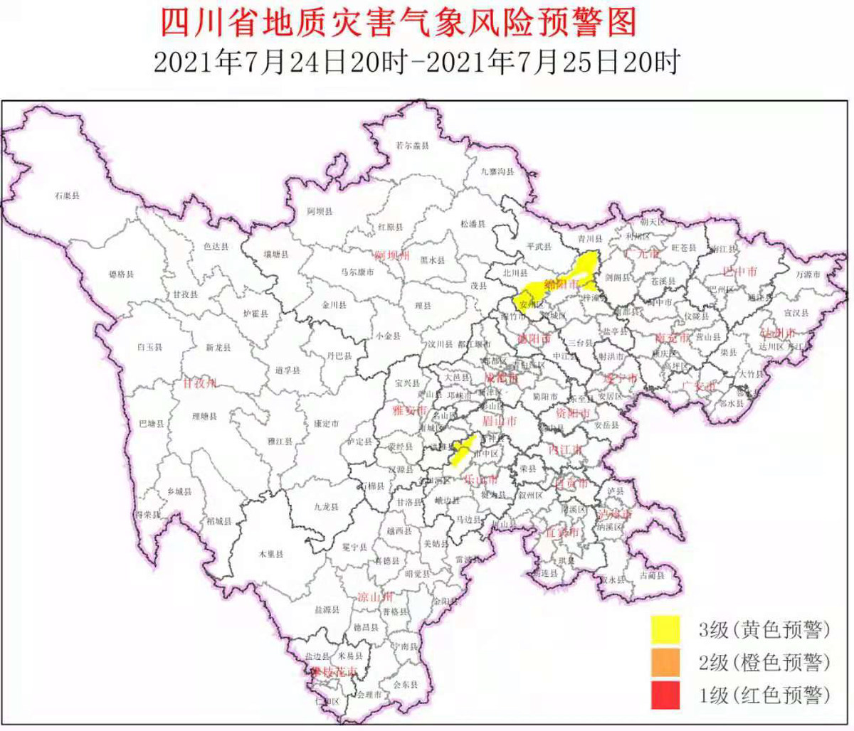 7月24日,四川省地质灾害指挥部办公室根据四川省地质环境条件,结合四川省气象台天气预报情况,发布如下预警:7月24日20时至7月25日20时,绵阳市安州区、江油市、梓潼县、北川县,乐山市峨眉山市、夹江县等2市6个县(市、区)进入黄色预警范围。