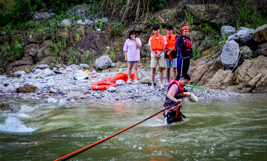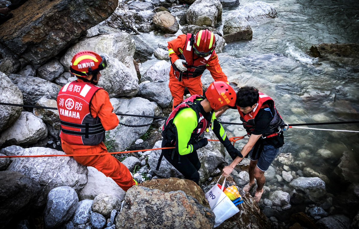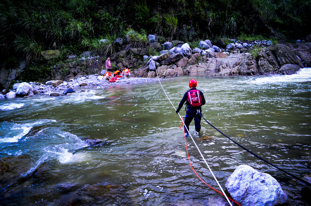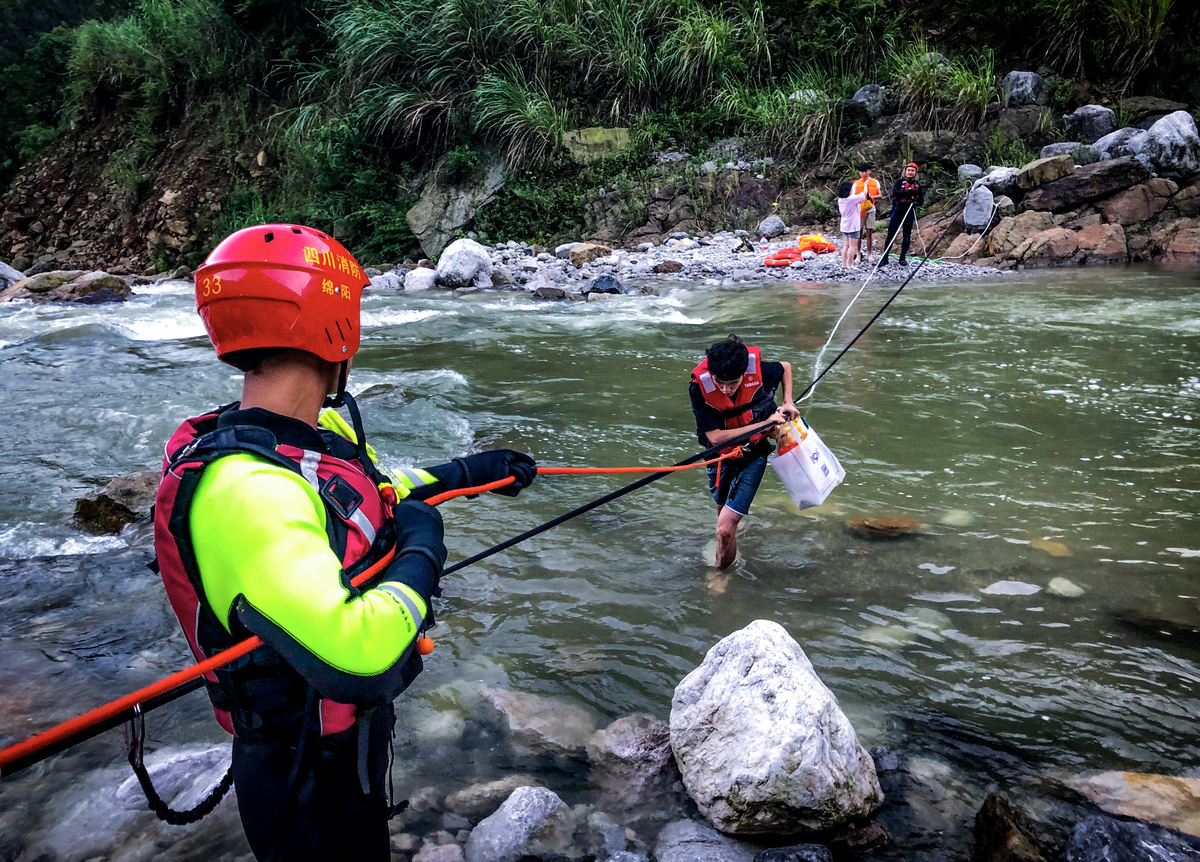 19时05分,救援站到达现场,立即对现场进行安全评估,试探水深,确定营救方案。现场水流很急,水齐腰,地势狭窄无法使用舟艇救援,带队干部针对现场情况采取架设绳桥的方式营救被困人员,命令一名水性较好的消防员做好人个防护淌水至对岸进行双绳桥架设,并对被困人员穿着救生衣和安全吊带保护,依靠双绳桥采取淌水过河的方式依次将4名被困人员营救至安全地带。营救过程中,消防员边用漂浮绳牵引,边提醒被困人员淌水过河注意事项,经过一个多小时的紧张救援,4名被困人员成功营救至安全地带,无人员伤亡。随即救援站与现场民警做好交接后收整器材返回。