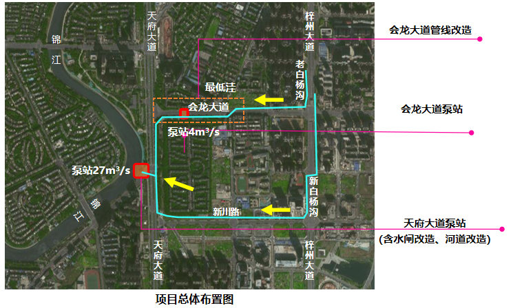 成都市会龙片区,位于天府大道、剑南大道、红星路南延线和海番路之间。这里地处城市交通主干线附近、人口稠密。但低洼的地势,以及附近的主要内涝排泄通道锦江华阳段河道宽度偏小、河床高度较高,极易在汛期对会龙片区等区域的管网形成顶托乃至倒灌,最终加剧内涝程度。