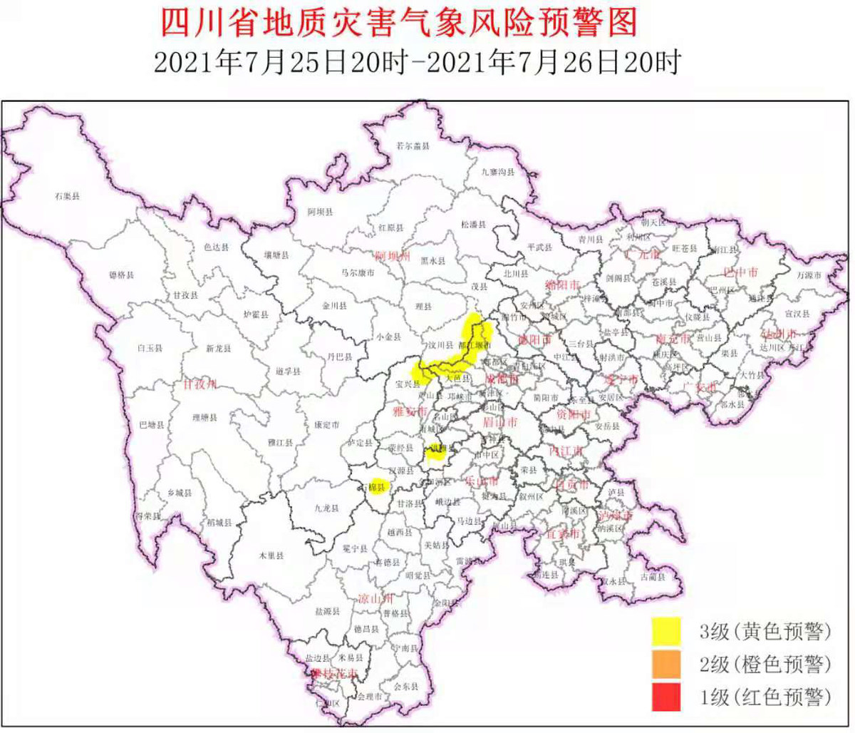 7月25日,四川省地质灾害指挥部办公室根据四川省地质环境条件,结合四川省气象台天气预报情况,发布如下预警:7月25日20时至7月26日20时,成都都江堰市、崇州市、彭州市、大邑县,雅安雨城区、芦山县、宝兴县、石棉县,眉山洪雅县,阿坝州汶川县等4市(州)10个县(市、区)进入黄色预警范围。