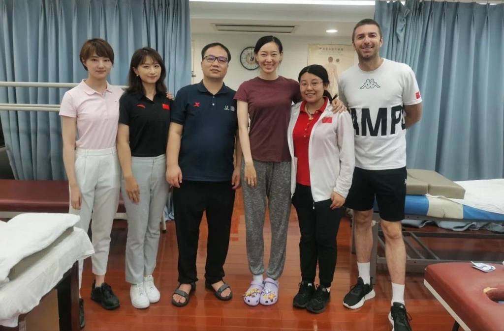 成都体育学院运动康复保障团队(左:张纯、汪敏加、何春江)与奥运冠军孙一文(右三)合影