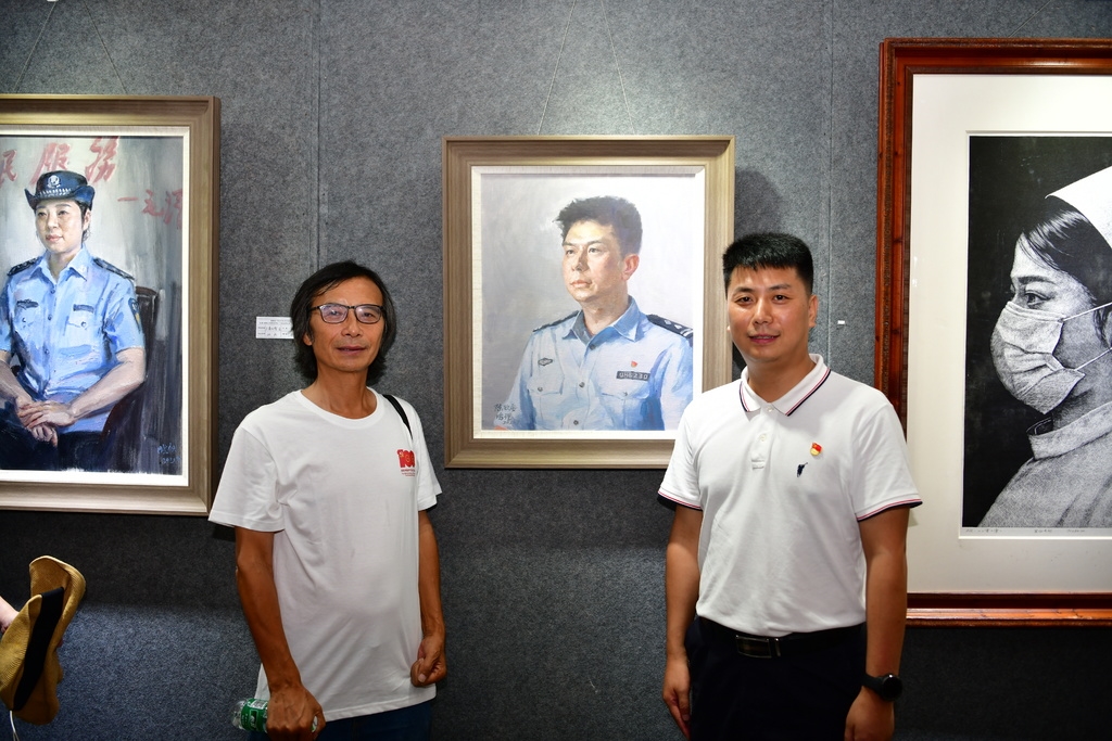 在展厅入口处右侧,有一幅简洁的肖像油画吸引大量参观者驻足观看。画中,一名身着蓝色警服的男子,身姿挺拔,凝视前方。他就是广安市公安局网络安全保卫支队政委陈界安,当天他也在现场。“哎呀,你和这幅画里这个人好像呀!”,当被参观者们认出画中本尊,并请求合影时,这个见过“大场面”的公安民警却也略显腼腆。