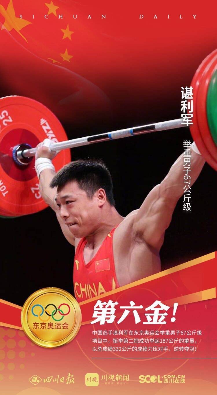 【第6金】在晚间进行的男子67公斤级比赛中,谌利军在抓举落后6公斤的情况下,最终以抓举145公斤,挺举187公斤,总成绩332公斤力压对手,逆转夺冠,为中国队斩获第六金!