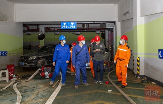 此时五六台抽水机不停抽水,但地库积水仍不见底。狭小的地下空间,不排除有细菌、空气稀簿甚至缺氧少氧的不确定风险,在确保采取安全措施后,他们穿上厚厚的防护服,不顾天气闷热、臭味扑鼻,深入勘察。
