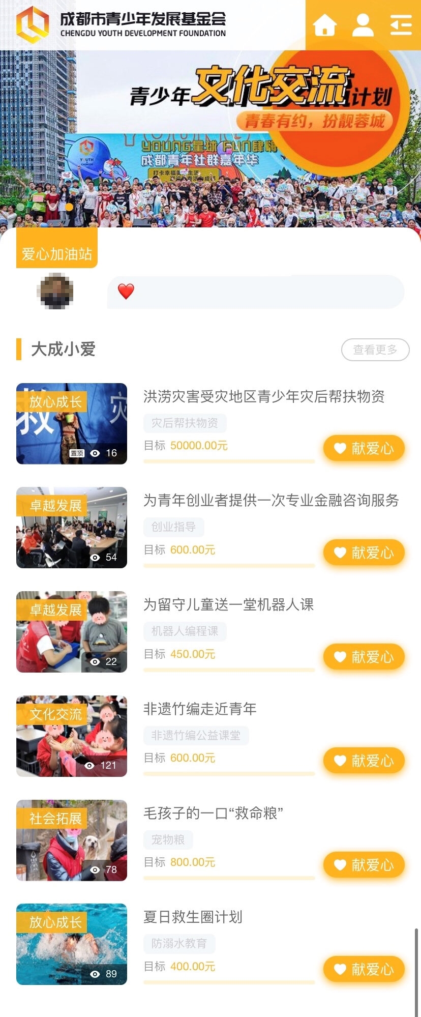据共青团成都市委相关负责人介绍,开启线上“随手公益”,能为广大爱心人士搭起一座更加便捷的奉献爱心桥梁,凝聚起共同关心关爱成都青少年事业发展的强大公益力量!广大爱心人士、企业、慈善组织可微信搜索“青聚锦官城”,点击右下角青春+YOU站——大成小爱板块参与公益募捐。