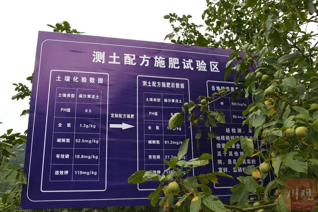 在基地观景台,竖着一块蓝底白字“测土配方施肥试验区”牌子,列出试验前后偏沙黄泥土PH值、全氮、有效磷、速效钾等含量数据变化。“基地全面进行测土配方施肥,实施品种改良2000亩,丰产管护实现全覆盖。”沙河镇蒲家核桃专业合作社法人侯明堂说,通过精细化管护,基地丰产增收效果明显。