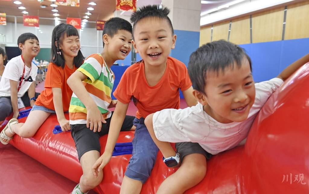7月27日,在成都天府软件园少儿托管中心,双职工家庭的娃娃在成都高新区菁蓉小学老师轮流照看下开心玩游戏。
