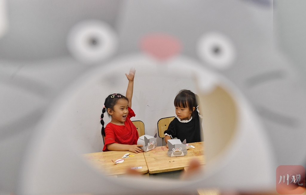 7月27日,在成都天府软件园少儿托管中心,双职工家庭的娃娃在成都高新区菁蓉小学老师轮流照看下一起做手工。