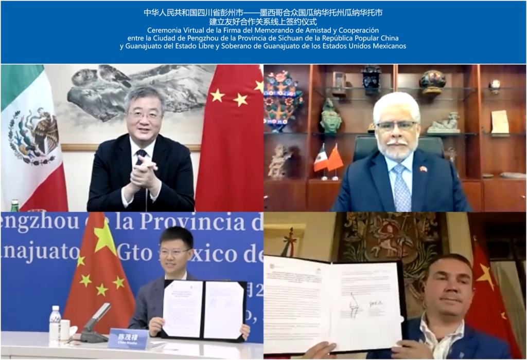 7月27日,成都市彭州市分别与墨西哥瓜纳华托市、哥伦比亚派帕市举行线上签约仪式,签署《建立友好合作关系备忘录》。