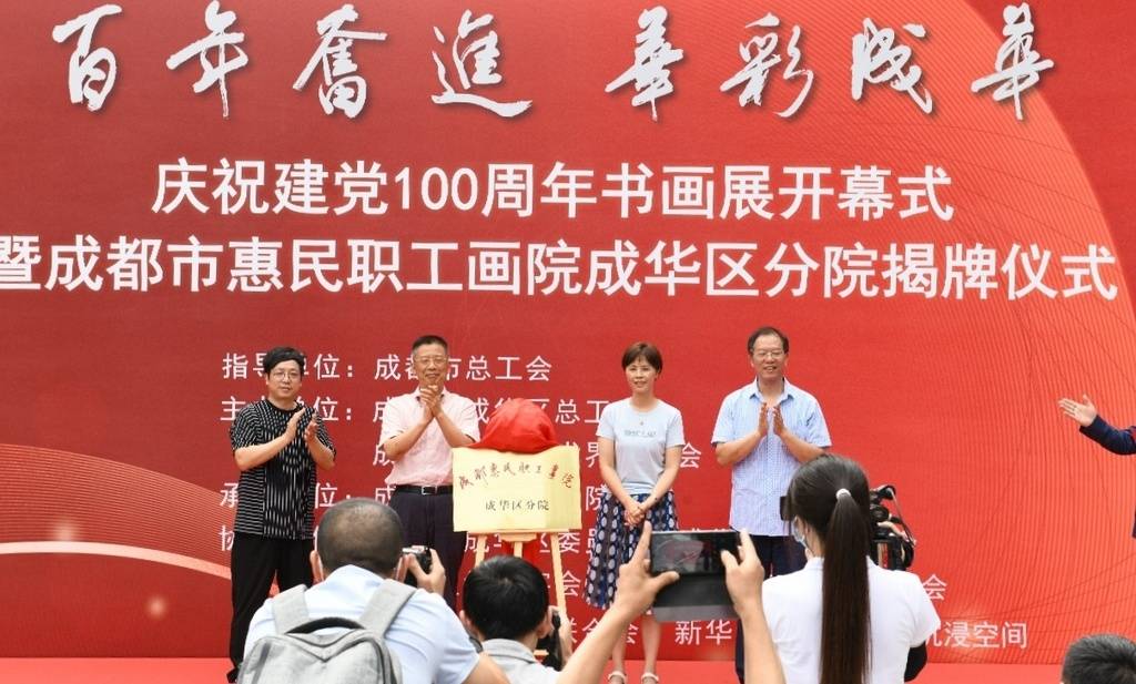 展览开幕的同时,还举行了成都惠民职工画院成华区分院揭牌仪式,成都市总工会、成华区总工会领导为成都惠民职工画院成华区分院揭牌。成都惠民职工画院由成都市总工会主管,画院努力开拓,携艺术进入基层,服务企业,服务职工,为市政府三城三都建设添砖添瓦。此次成华区分院的设立,将推动成华区职工文化进一步发展,促进成都市各区(市)县职工书画艺术爱好者交流。展览现场组织了周啸天、曹辉、管苠棡、米金铭、李国洲、吴浩、戴晓、张承翥、徐鹏、马勇、陈江、何晓巍、邱六言等13位书画家进行笔会,与观展的群众进行现场交流。