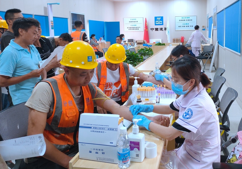 7月29日,在成都环城生态综合修复项目工地,中建八局西南公司基础设施分公司工会联合成都第一骨科医院(青羊区医疗中心医院)为施工一线100余名工友“送”来爱心健康体检“福利”。