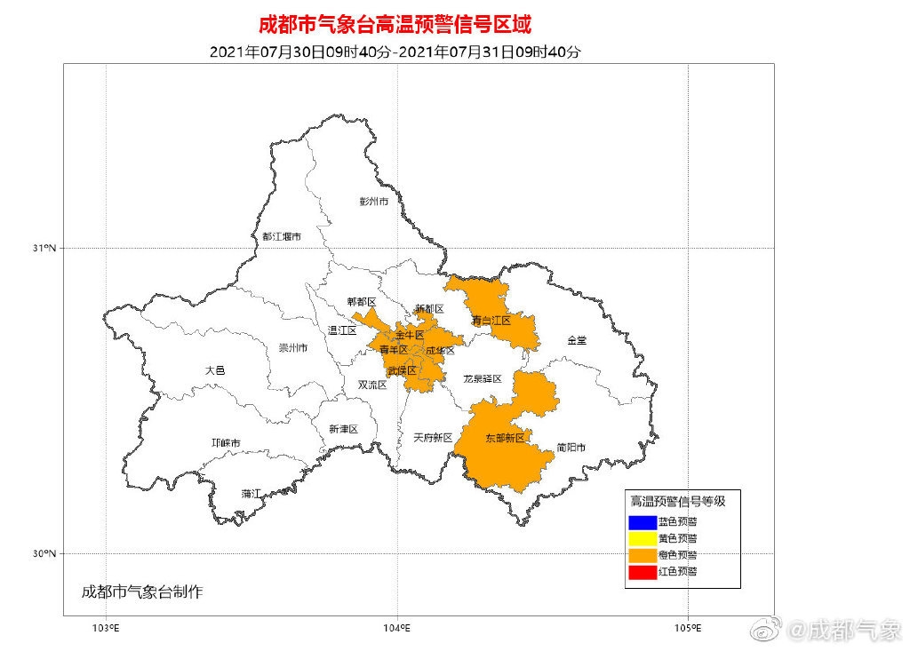成都市气象台7月30日9时40分对第21号高温橙色预警信号进行确认:预计未来24小时成都市东部新区、锦江区、青羊区、武侯区、成华区、金牛区、高新南区、高新西区和青白江区的大部分镇(街道)最高气温将升至35℃以上,35℃以上高温主要出现在13时至18时。请注意防暑降温。