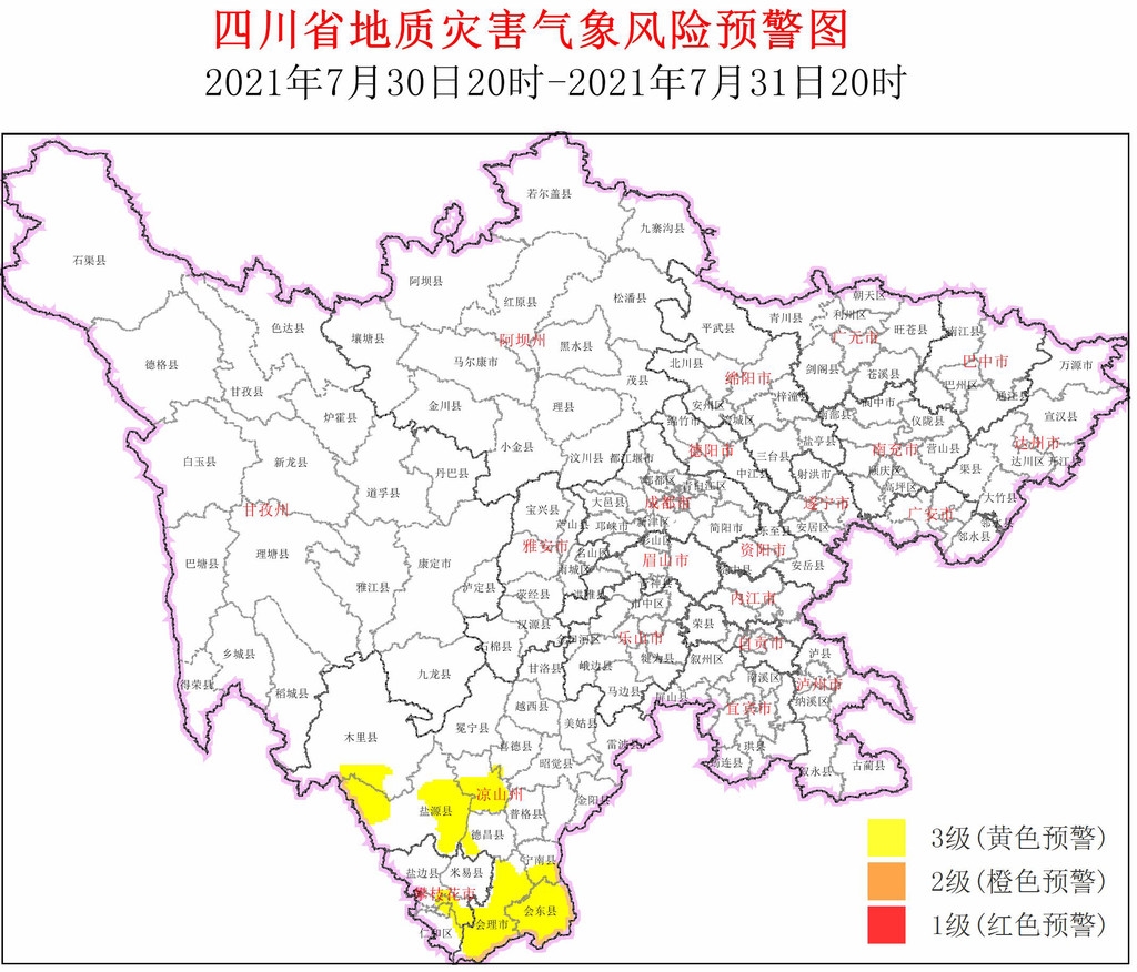 周末即将来临,成都持续高温天气,攀西地区则迎来降雨。7月30日,四川省地质灾害指挥部办公室根据四川省地质环境条件,结合四川省气象台天气预报情况,发布如下预警:7月30日20时至7月31日20时,攀枝花东区、仁和区、盐边县,凉山州西昌市、会理市、木里县、盐源县、德昌县、会东县、宁南县、普格县、喜德县等2市(州)12县(市、区)进入黄色预警范围。