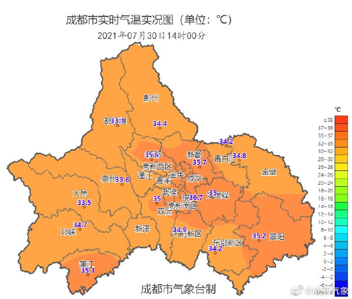 在成都市气象台的实况监测图上,7月30日14时,成都市各区域的气温是一片深浅不一的红色。