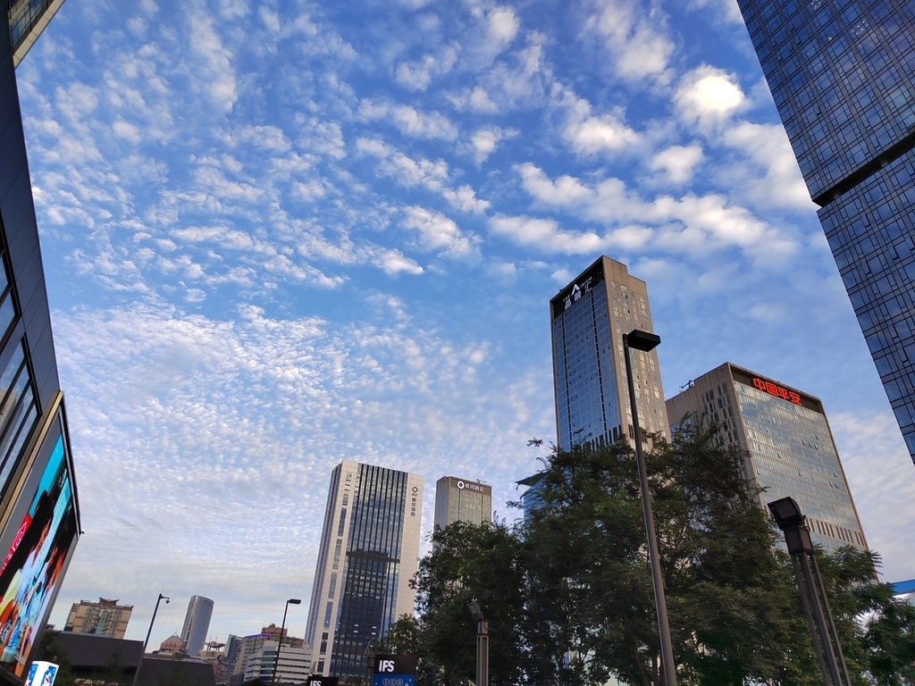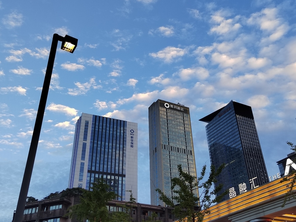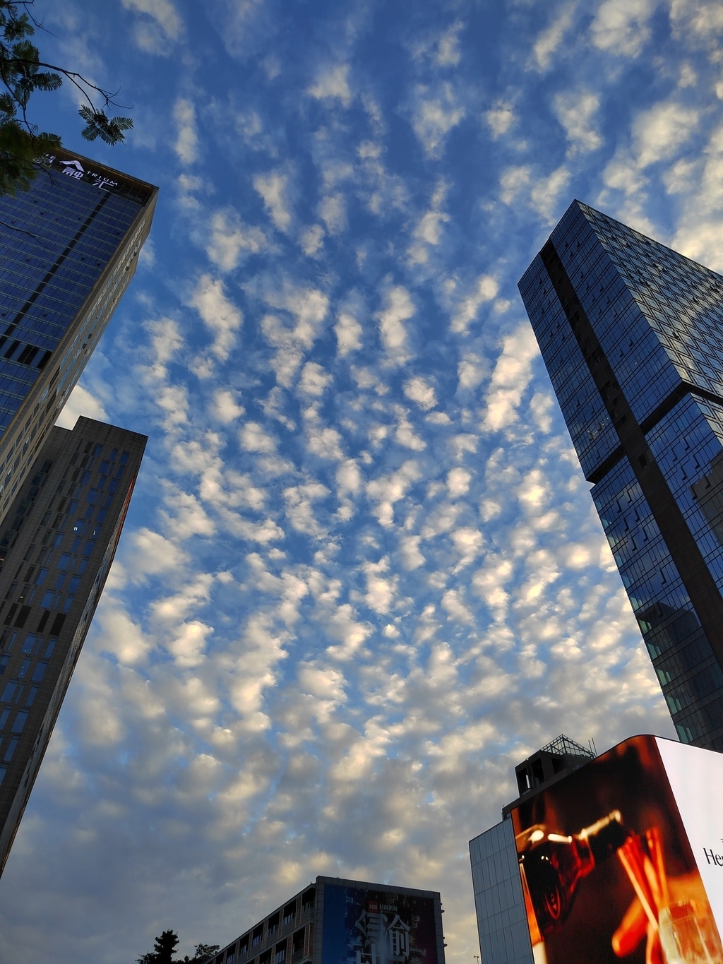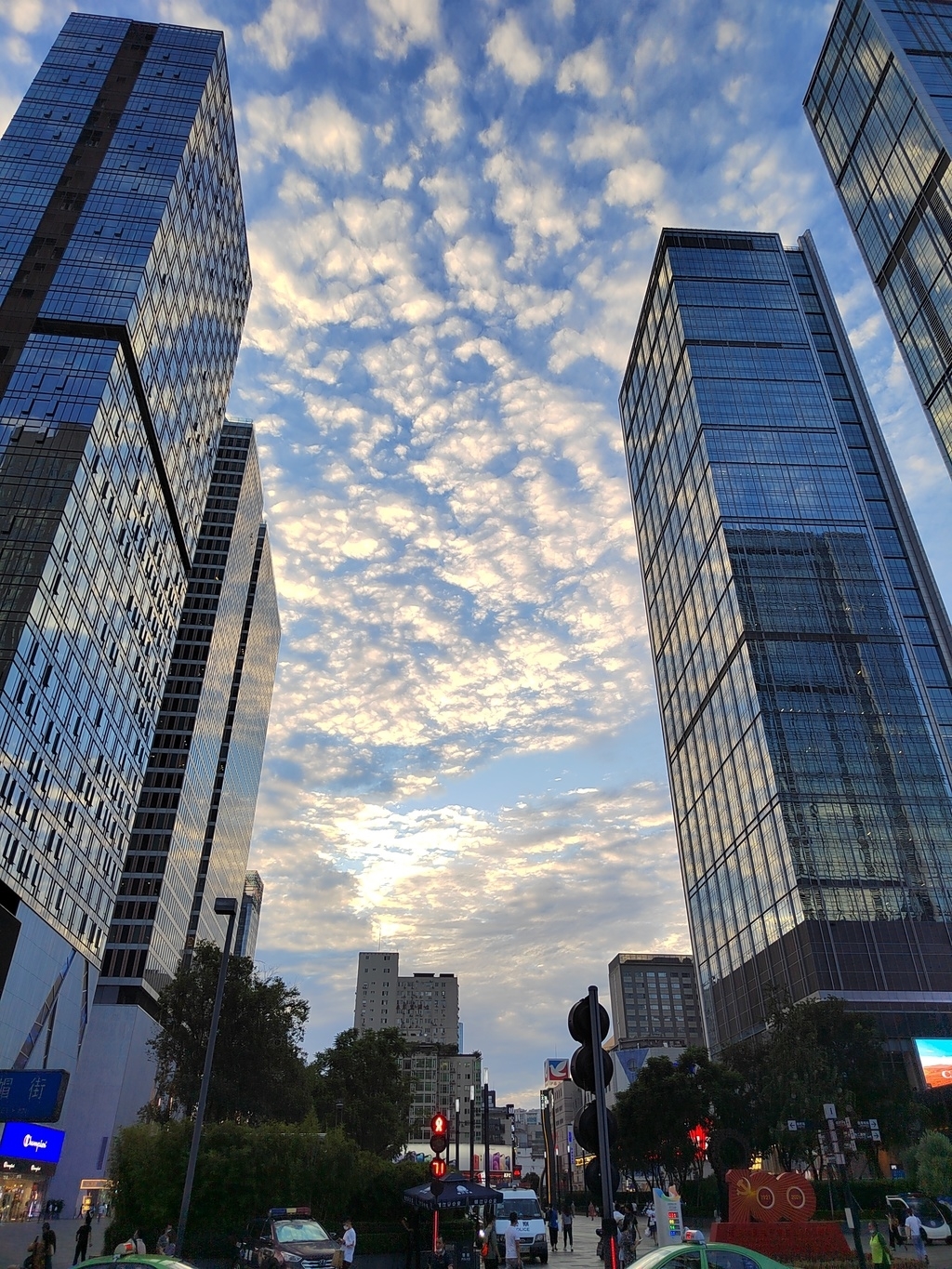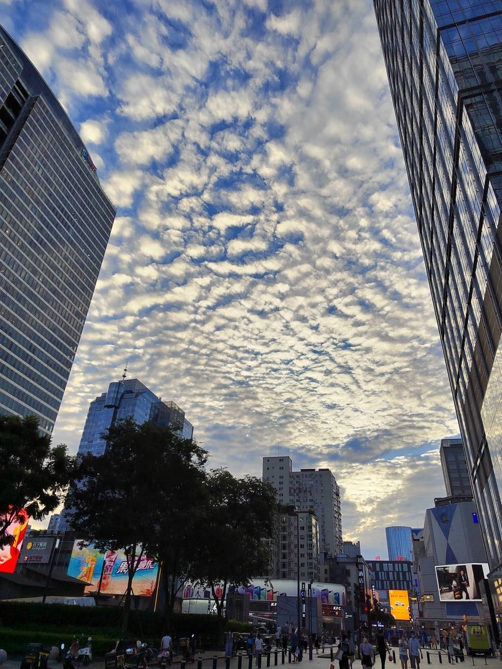 7月30日黄昏,成都市天空云朵似棉花团一样。夕阳西下,微风轻拂,云朵不停变幻着色彩和形状,给都市夏日的天空带来了一幅幅绚丽的画面,市民纷纷走上街头,驻步欣赏这难得盛夏美景。