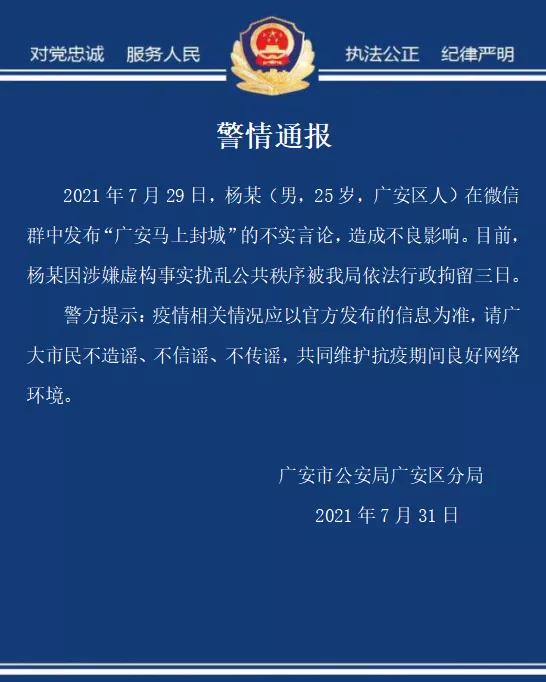 日前,广安市公安局广安区分局发布警情通报称,2021年7月29日,杨某(男,25岁,广安区人)在微信群中发布“广安马上封城”的不实言论,造成不良影响。目前,杨某因涉嫌虚构事实扰乱公共秩序被该局依法行政拘留3日。