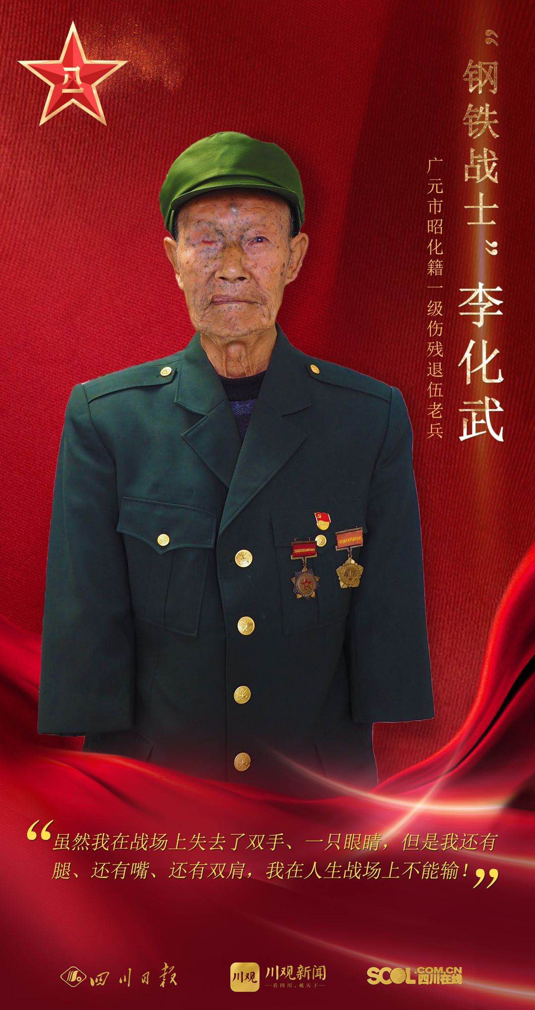 7月29日,广元市昭化区举行“参战老兵”庆祝建军94周年活动,一位无手老兵举臂齐额的军礼,在一片绿军装中非常特别。
