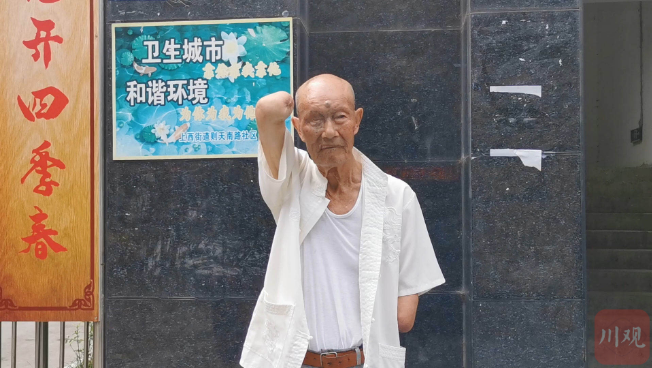 行“残臂军礼”的老兵名叫李化武,88岁,广元市昭化区元坝镇云雾村人,党龄66年。